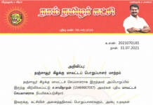 க.எண்: 2021070182 நாள்: 29.07.2021 அறிவிப்பு:  திருவள்ளூர் நடுவண் மாவட்டப் பொறுப்பாளர்கள் மாற்றம் திருவள்ளூர் நடுவண் மாவட்டத் தலைவராக இருந்தவர் அப்பொறுப்பில் இருந்து விடுவிக்கப்பட்டு பா.இராஜ்முருகன் (01332361639) அவர்கள் புதிய மாவட்டத் தலைவராக நியமிக்கப்படுகிறார். அதேபோன்று திருவள்ளூர்...