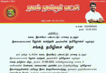 நாம் தமிழர் கட்சியின் கலை, இலக்கியப் பண்பாட்டுப் பாசறை நடத்தும், இசையமைப்பாளர் ஜேம்ஸ் வசந்தன் அவர்களினுடைய 'தமிழோசை' வழங்கும் சங்கத் தமிழிசை விழா வருகிற 17-09-2022 சனிக்கிழமையன்று மாலை 5 மணியளவில்...