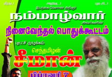 நாம் தமிழர் கட்சி இளைஞர்பாசறை சார்பில் இயற்கை வேளாண் அறிஞர் நம்மாழ்வார் நினைவேந்தல் பொதுக்கூட்டம் 07 பிப்ரவரி, 2014, வெள்ளிக்கிழமை மாலை 5 மணிக்கு பெரியார் திடல், கோபிச்செட்டிபாளையத்தில் நடைபெரவிருக்கிறது. இதில் செந்தமிழன்...